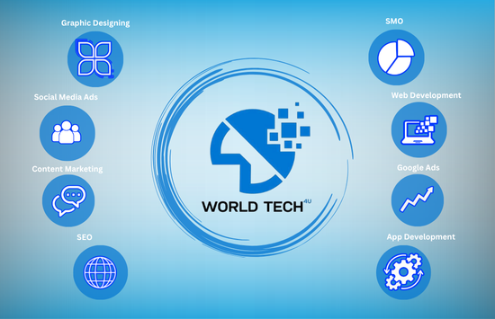 World Tech 4U specializes in social media ads, Google Ads, content marketing, SMO, web development, SEO, app development, and graphic design.